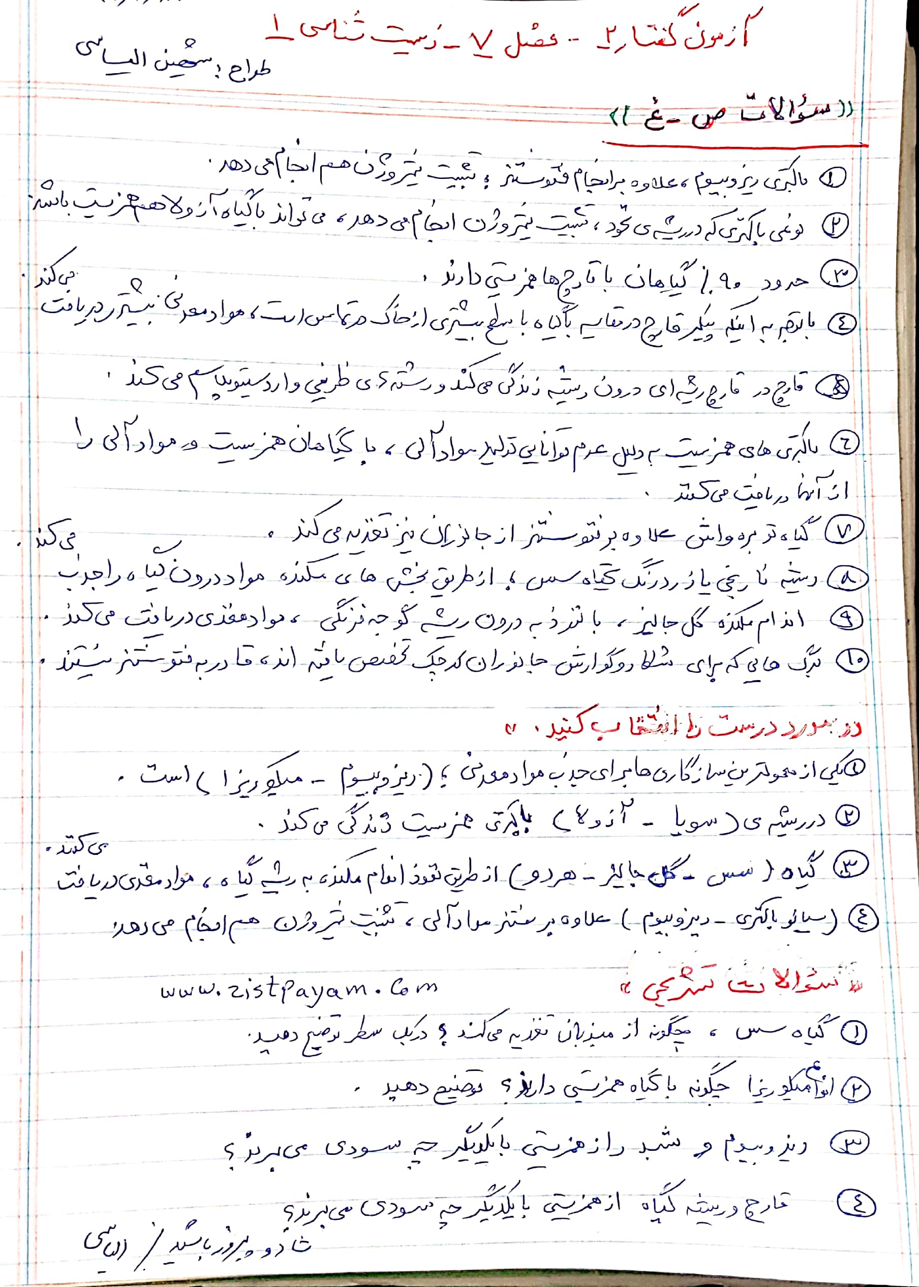 1.غ 2.غ 3.غ 4.ص 5.غ 6.ص 7.ص 8.ص 9.ص 10.غ مورد درست 1.ریزوبیوم 2.سویا 3.هردو 4.سیانو باکتری تشریحی 1. این گیاه ساقه نارنجی یا زرد رنگی تولید می کند که فاقد ریشه است گیاه سس به دور گیاه سبزه میزبان خود میپیچد و اندام های مکنده ایجاد می کند که به درون آوند های گیاه نفوذ و مواد مورد نیاز به انگل را جذب میکند